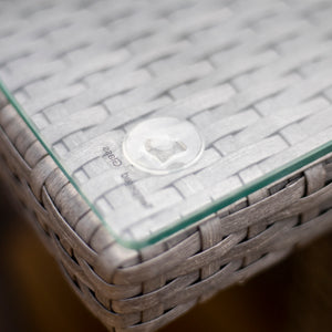 It is manufactured from a Slate Grey flatweave handwoven around an aluminium frame and the outdoor dining table is finished off with a 5mm tempered glass top.