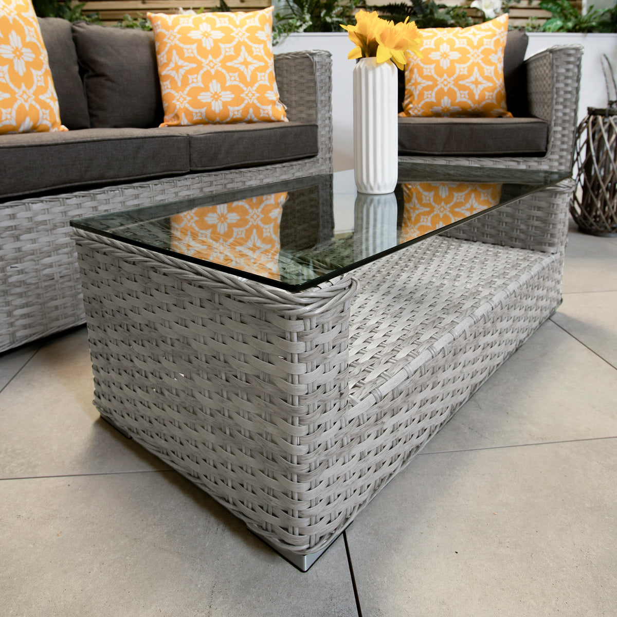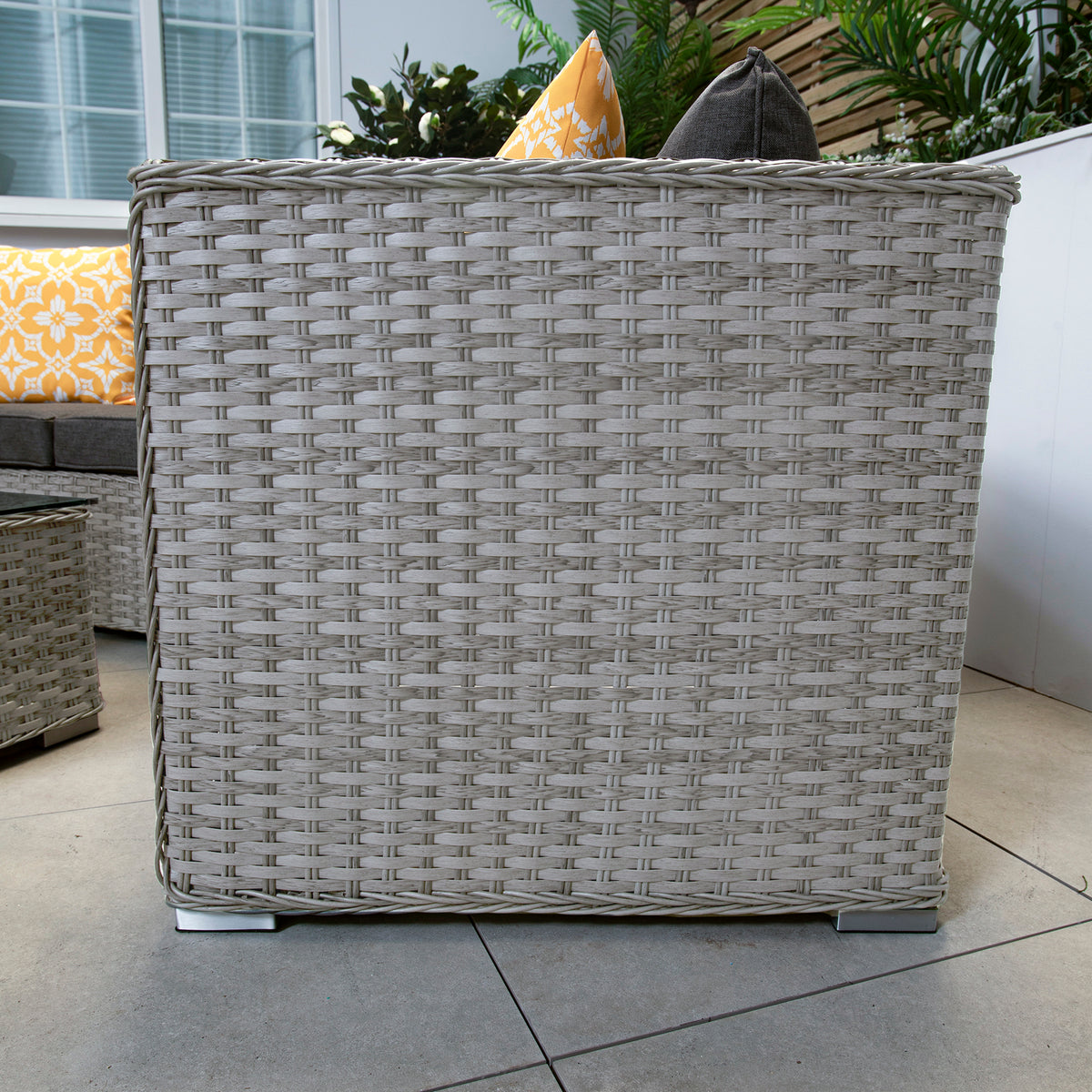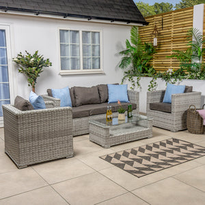 The flat and round weave rattan used in this outdoor sofa set is UV and weather resistant, and the powder coated aluminium frames are strong and rust-free.