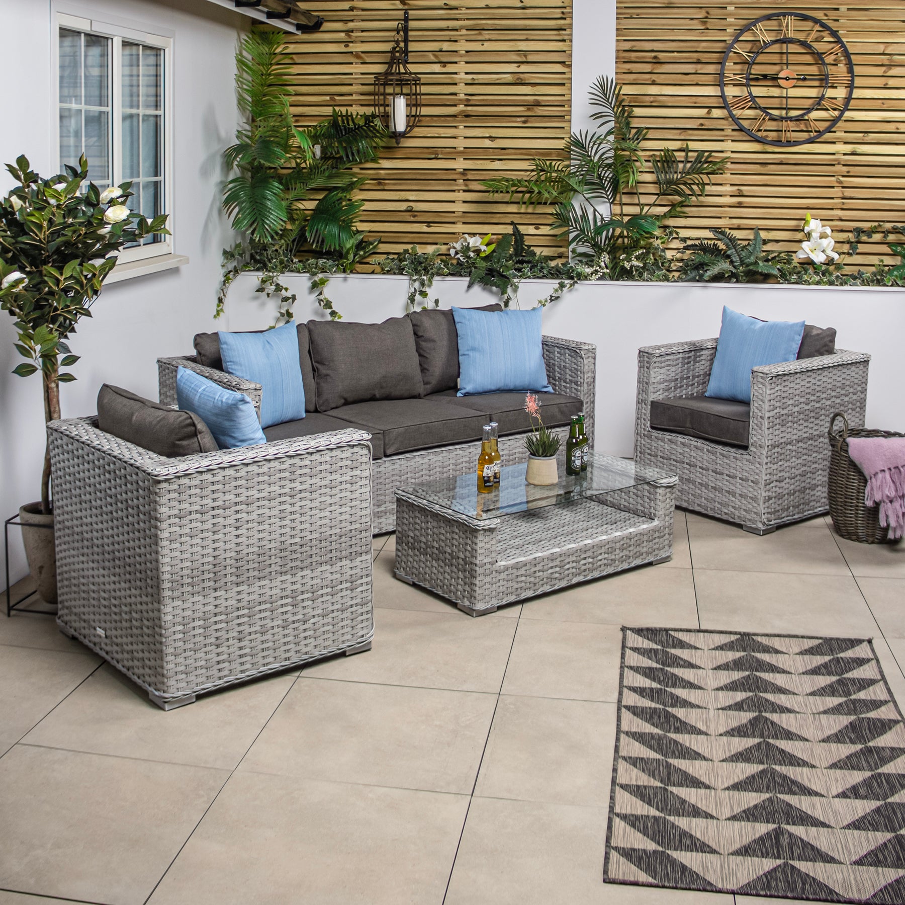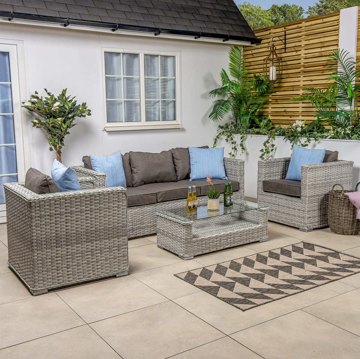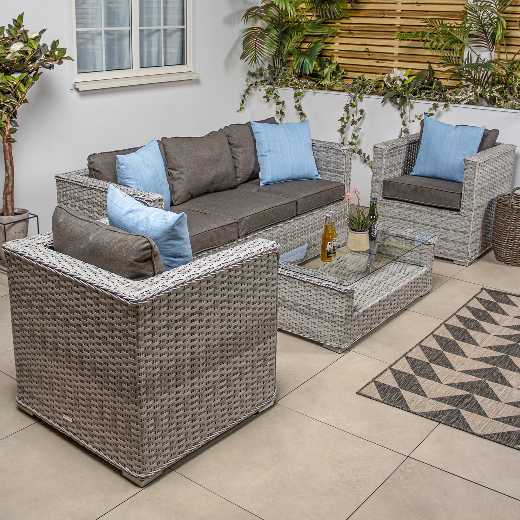 The two outdoor garden armchairs are extraordinarily comfy for reading or relaxing, while the 3 seater rattan outdoor sofa is perfect for relaxing with a friend after a long day.
