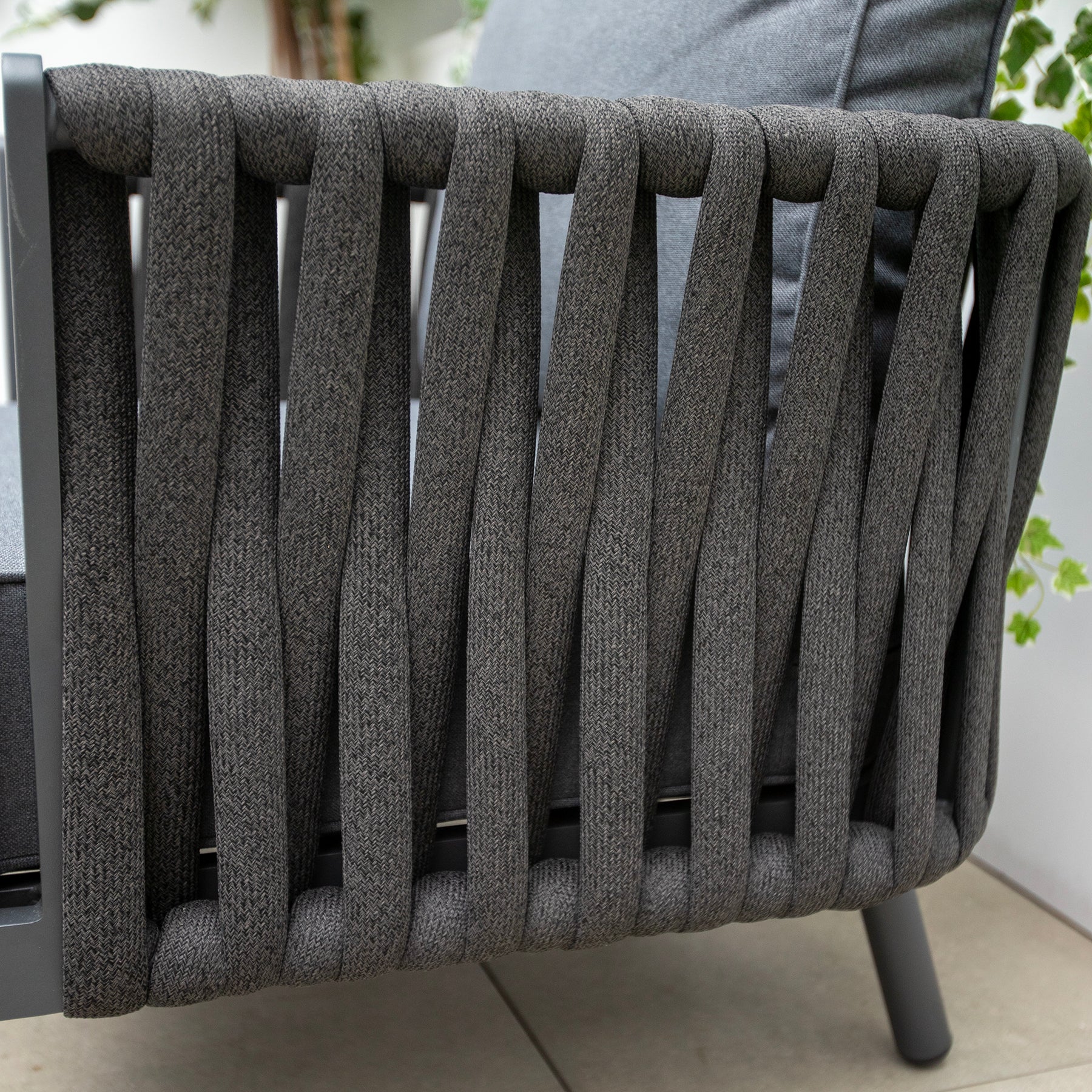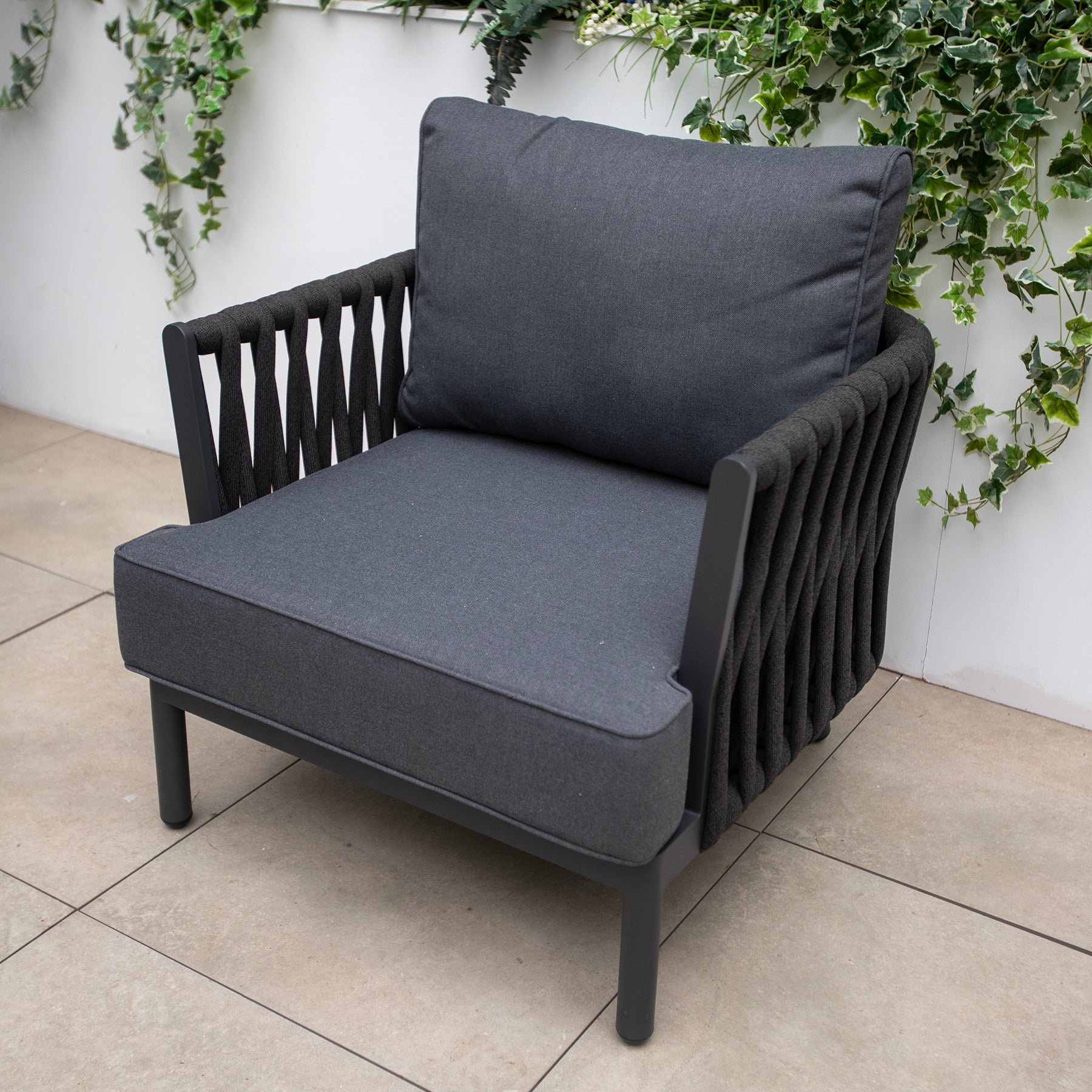 The rope used for the lounge chair and sofa is 4cm charcoal polyester with a rubber core, ensuring the rope doesn't become saturated and allows for quick drying time. Both hardwearing and comfortable, the chairs come with 10cm deep cushions for your comfort and the removable cushion covers are easy to clean.