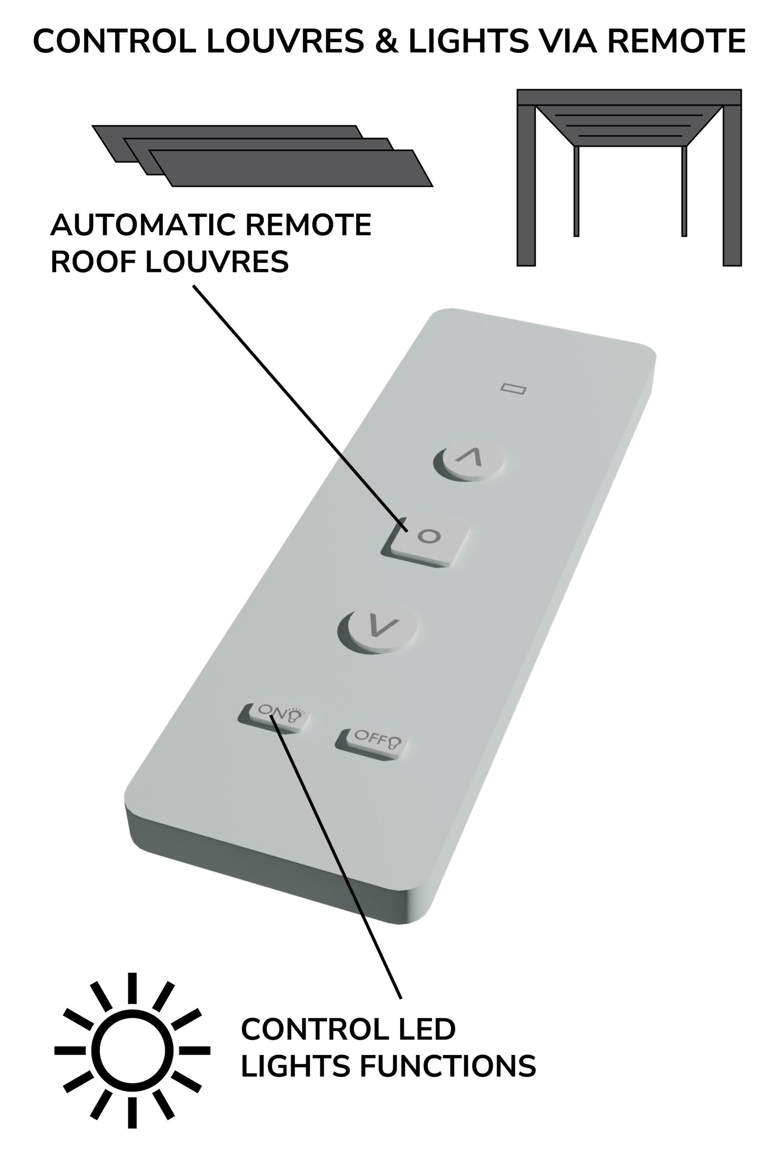 Set the perfect mood with the built-in LED lights. Mounted round the perimeter of the pergola and also on selected louvres, theses lights are perfect for evening entertaining and you can easily adjust the lighting to suit any occasion and all with a remote control.