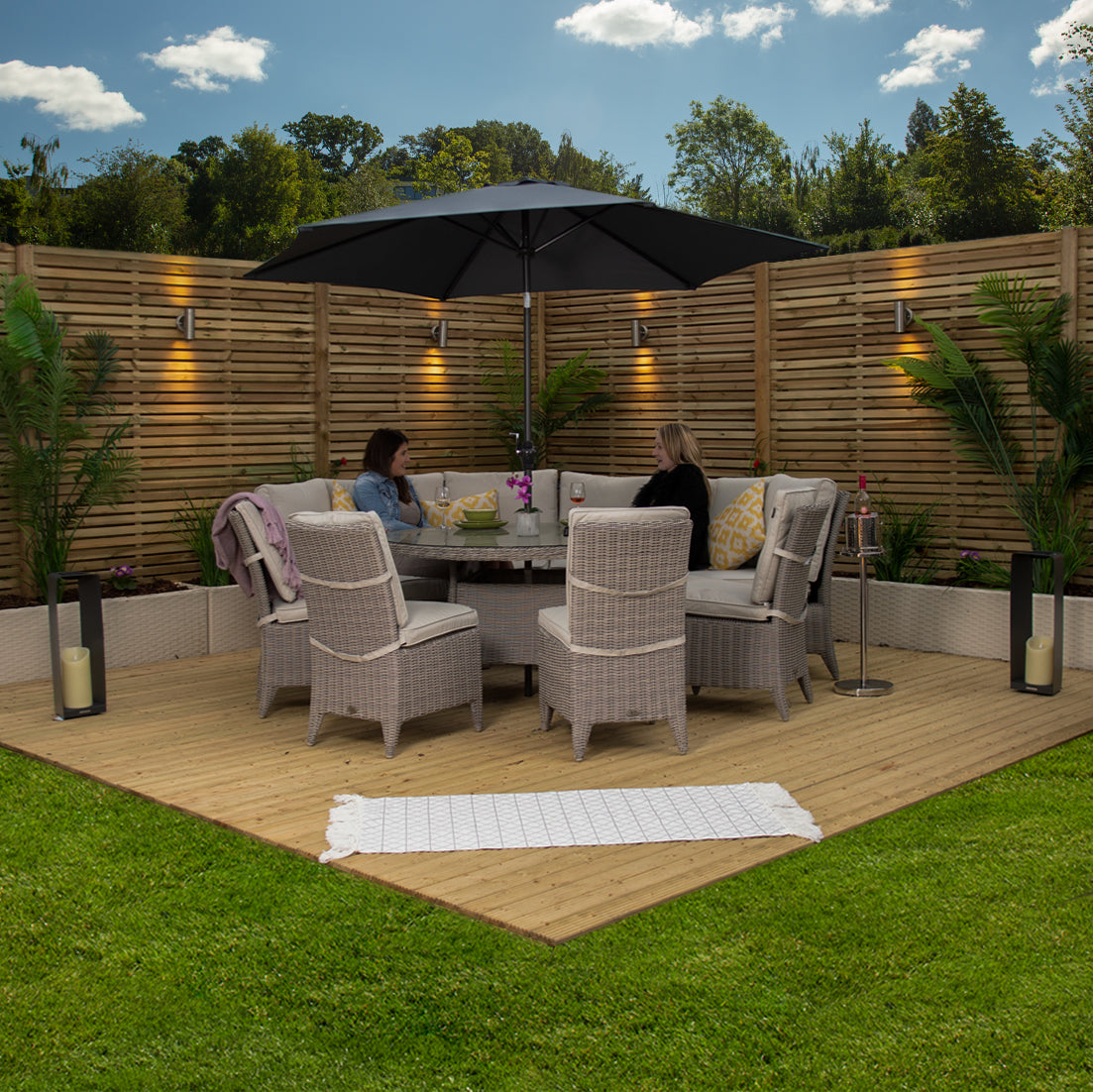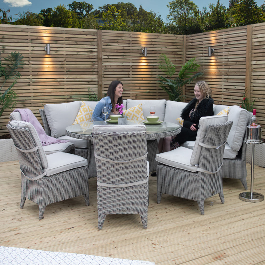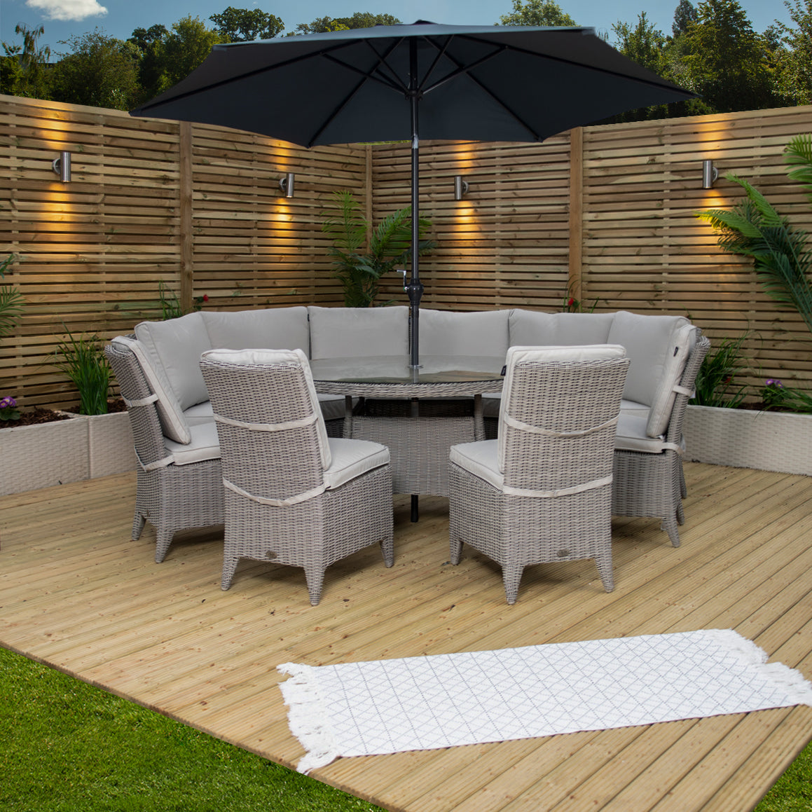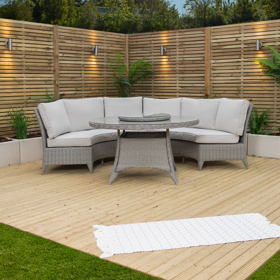 The 1.35m glass-topped outdoor table comes with a handy Lazy Susan, especially useful if you are catering for 10! The 6 seater curved sofa provides a relaxed dining experience and the 4 outdoor dining chairs enable a more formal position.