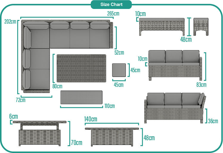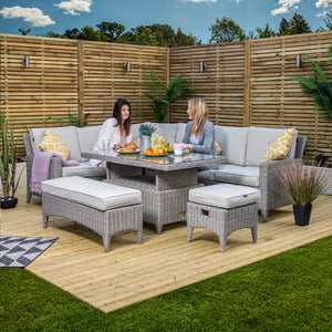 Comfortably seating between 6 and 9 people, this casual dining set comes with a height adjustable table so you can set it at a height for outdoor dining or lower for relaxing in the sun.