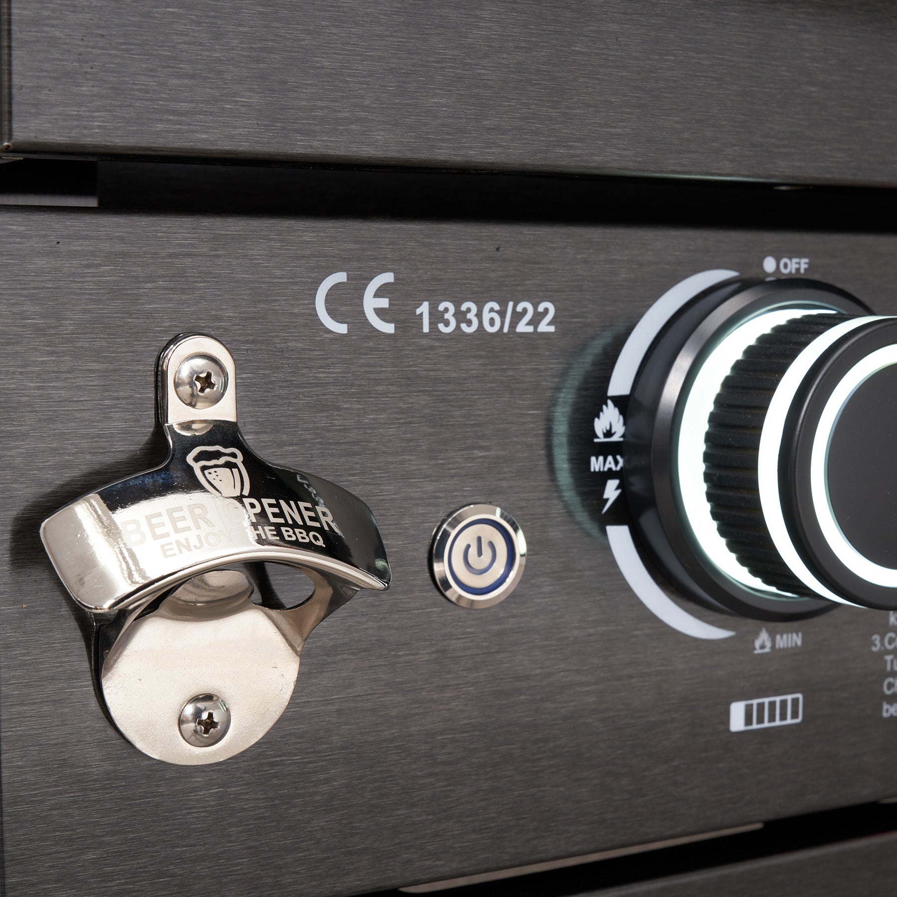 The burner controls have individual back light colour changing from white to red, indicating which burners are in use. The whole barbecue is constructed from high corrosion resistant solid 304 grade stainless steel to the burner box and framework.