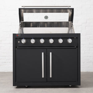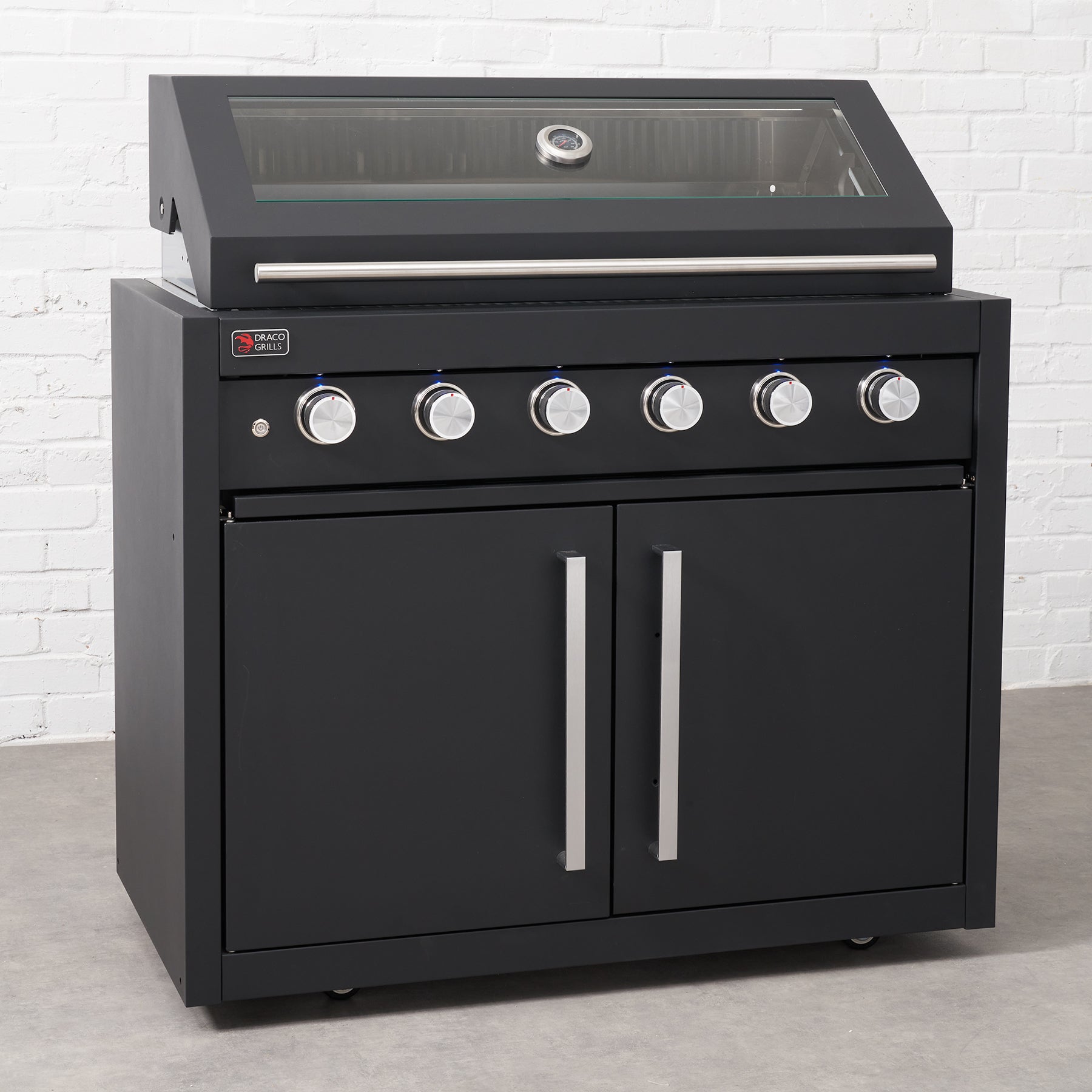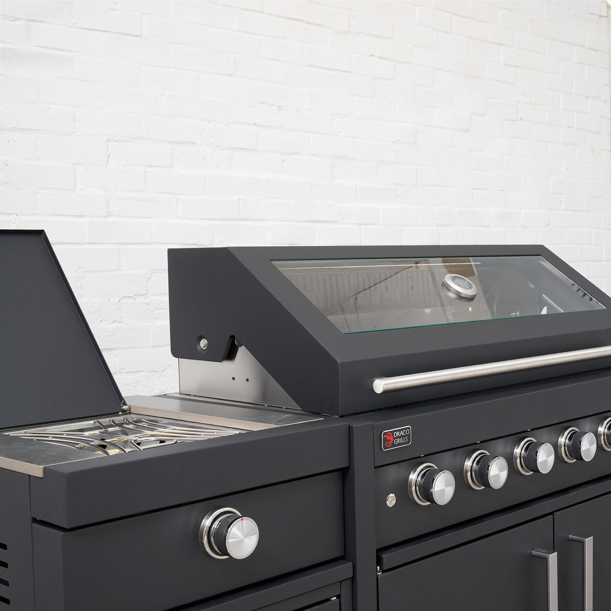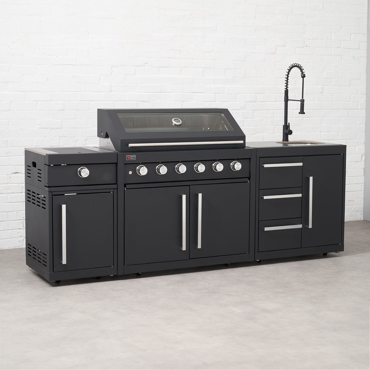 • Everything you need to set up your own little outdoor cooking area is in this Draco Grills Fusion Black Modular Outdoor Kitchen. It features a sink and 6 burner gas BBQ + side burner.