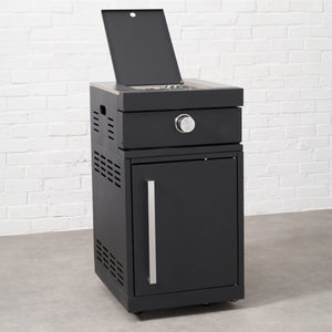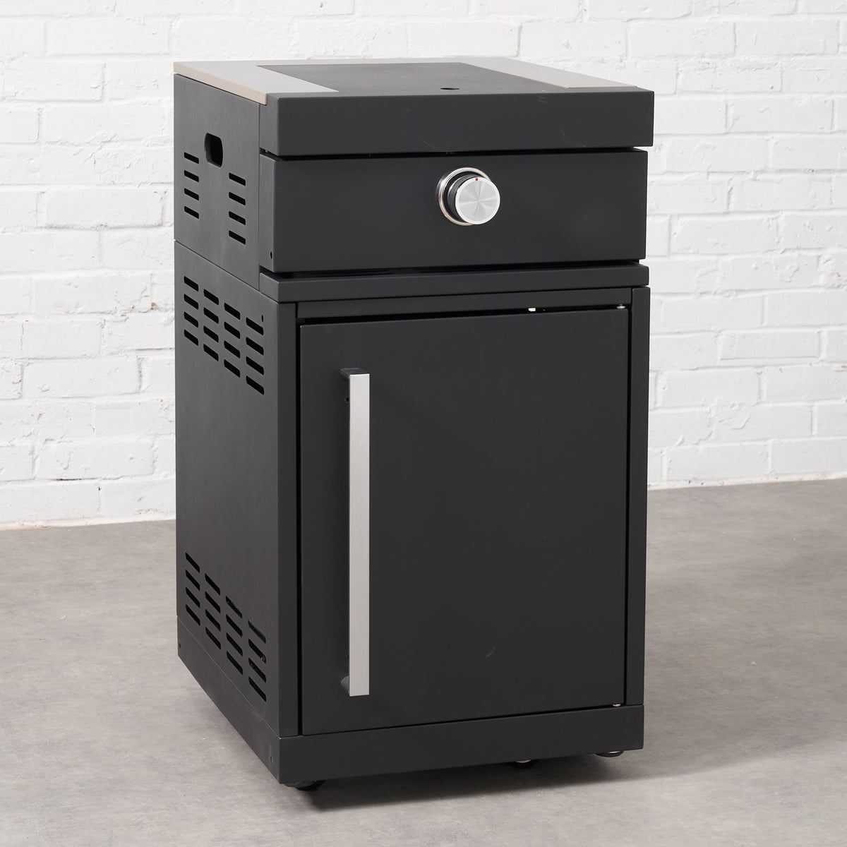 • Double-door cabinet underneath the BBQ with a fixed holder inside for storing 5kg gas bottles