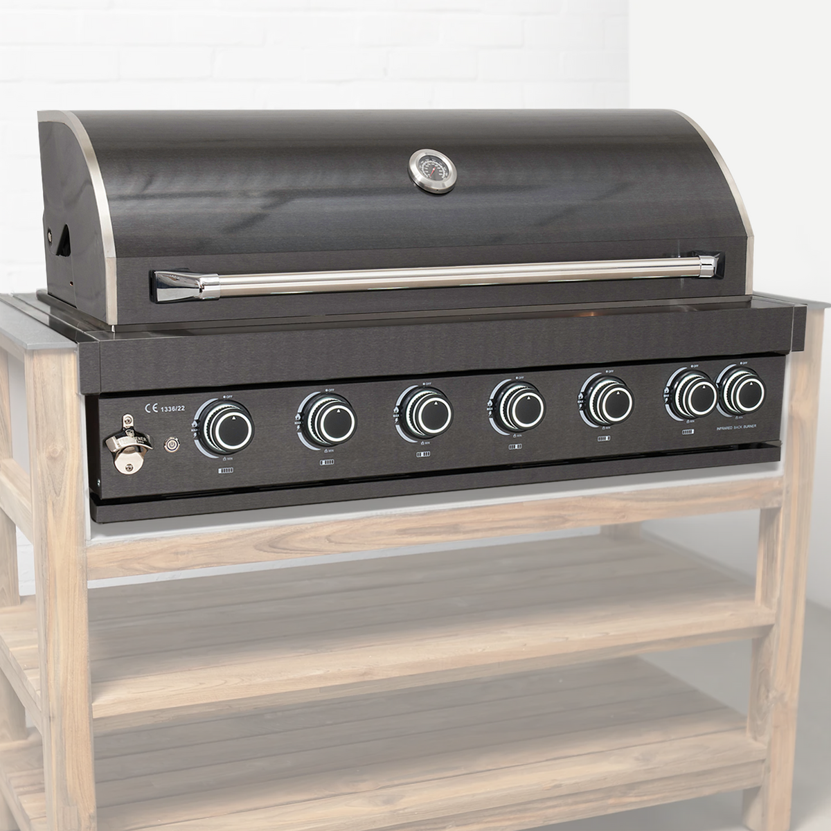 This 6 burner build in gas BBQ has a ceramic infrared rear burner for excellent grilling and cast stainless steel 'Power' burners that provide a steady flame from front to back for even and efficient heat distribution. It also has a double-skinned black stainless steel dome hood with 'cool to touch' technology.
