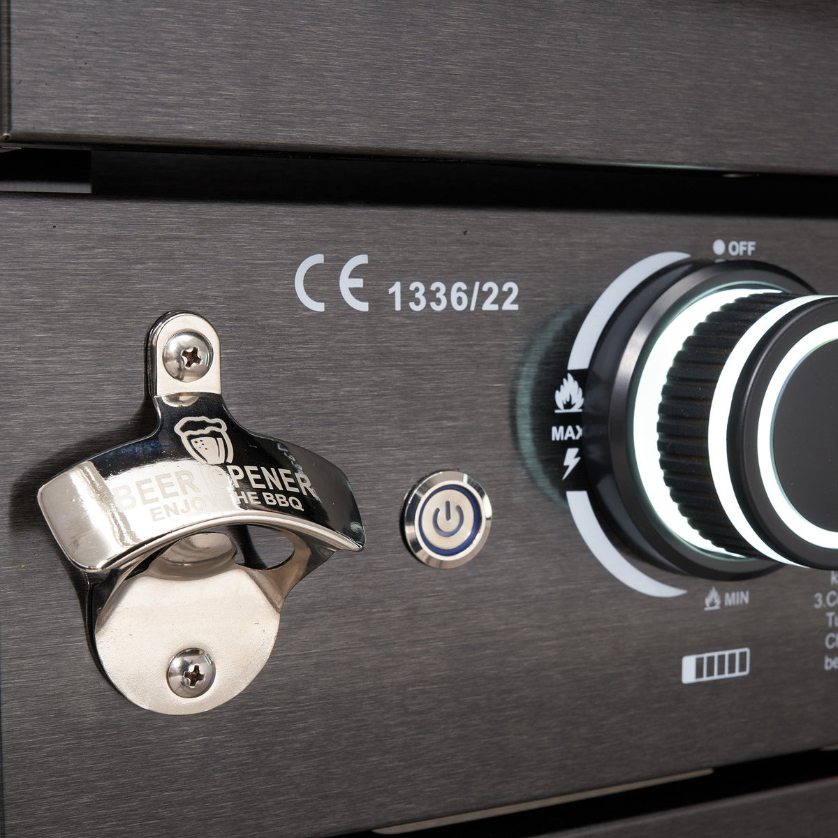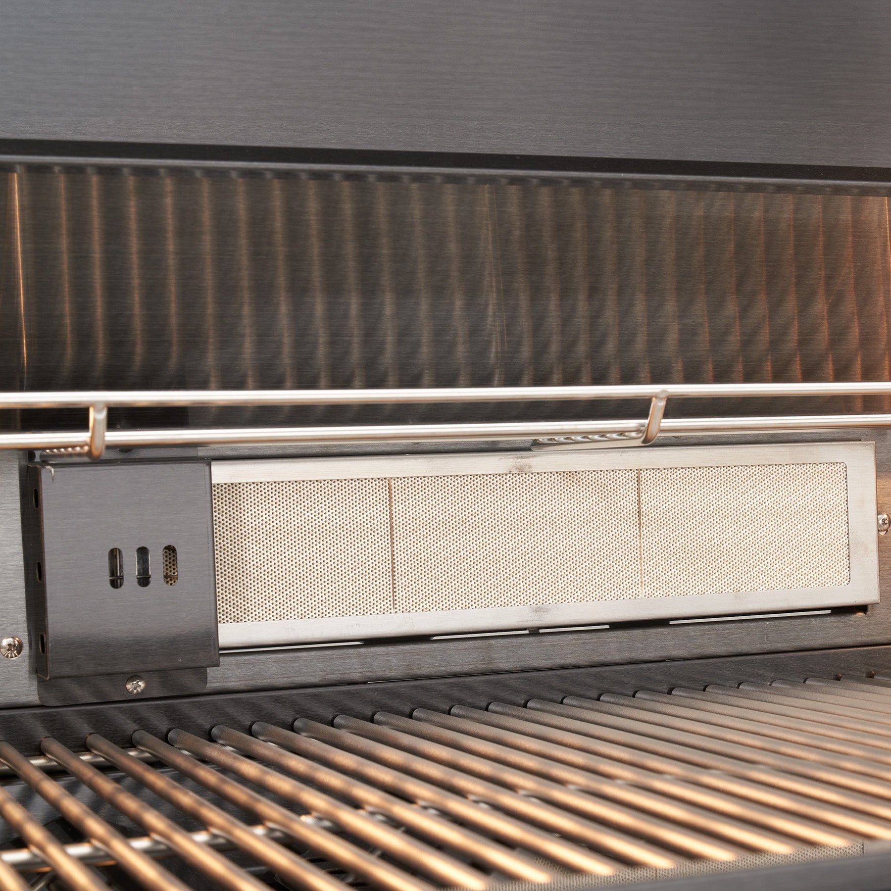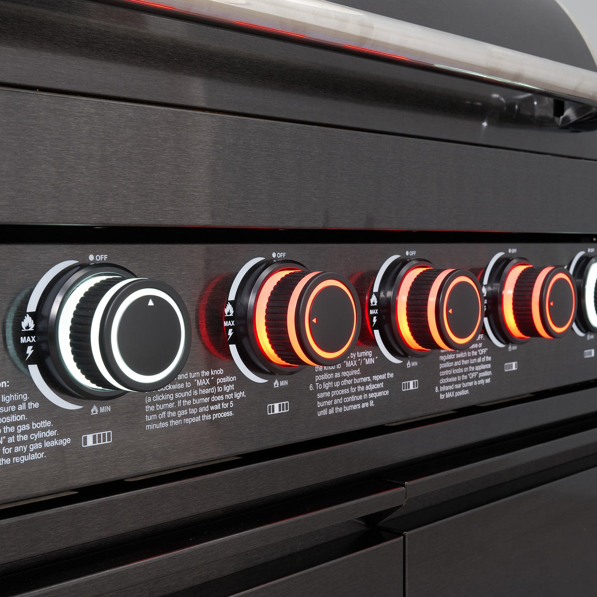 The distinct rear lights on the burner controls turn from white to red to indicate which burners are in use. Premium quality, corrosion-resistant stainless steel (304 grade) is used in the construction of the burner box, framework, and whole grill.