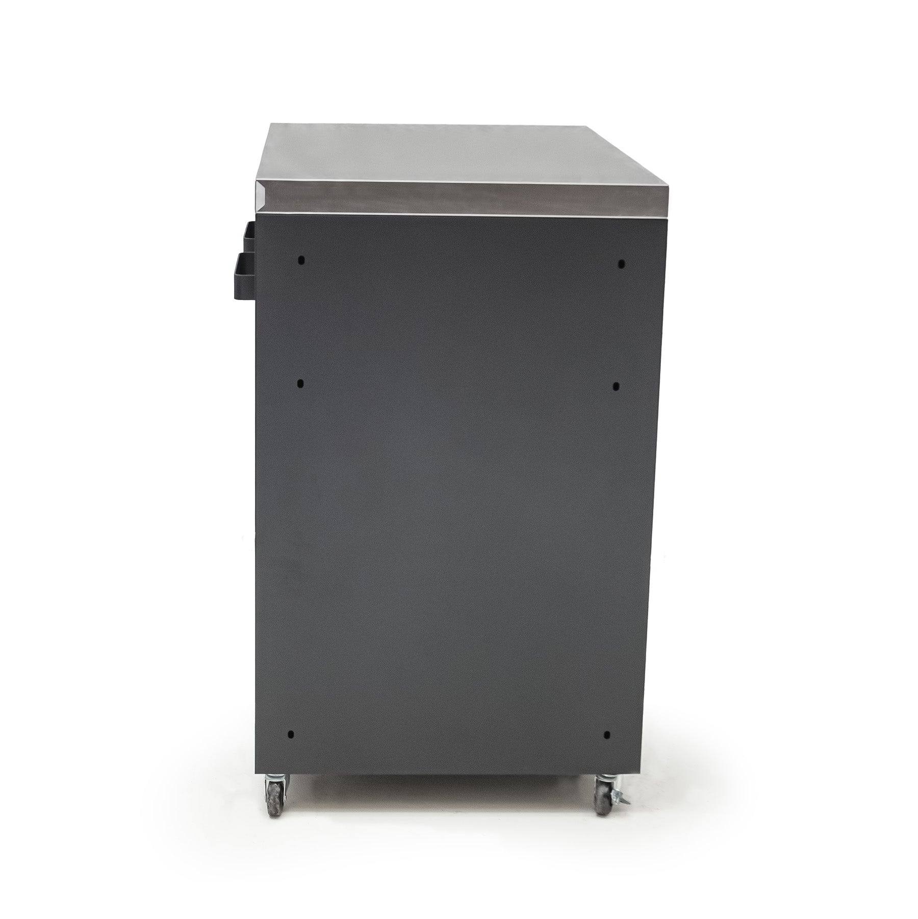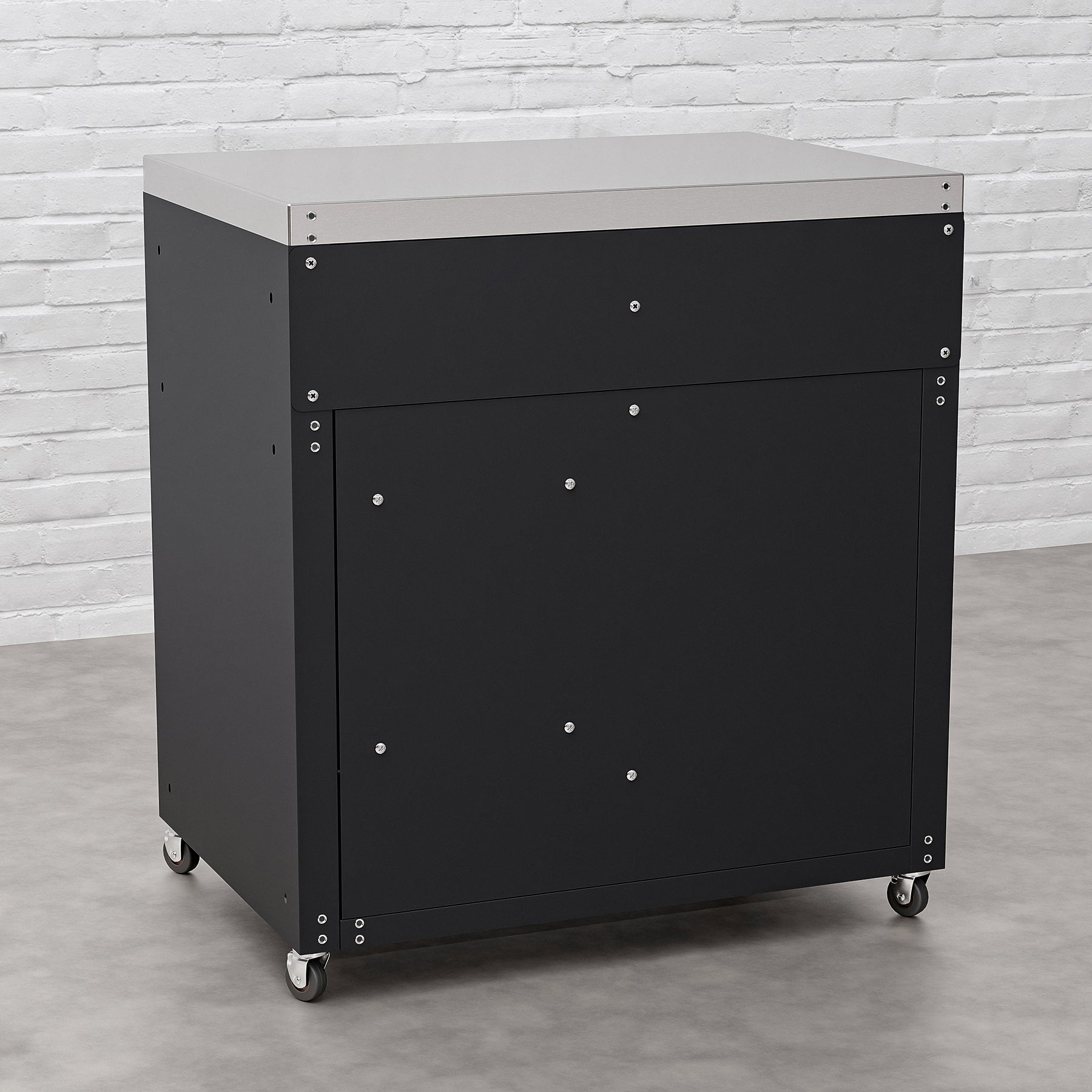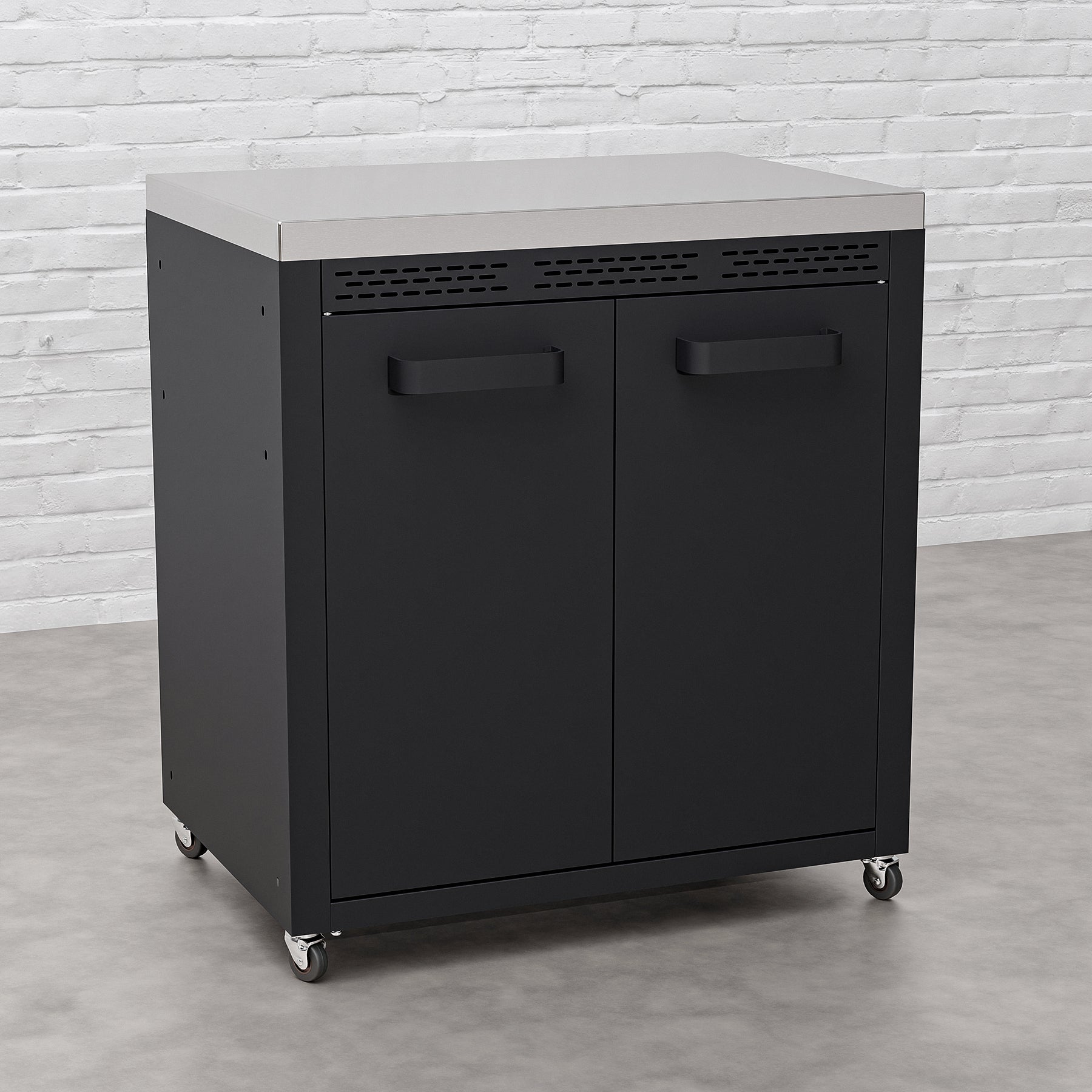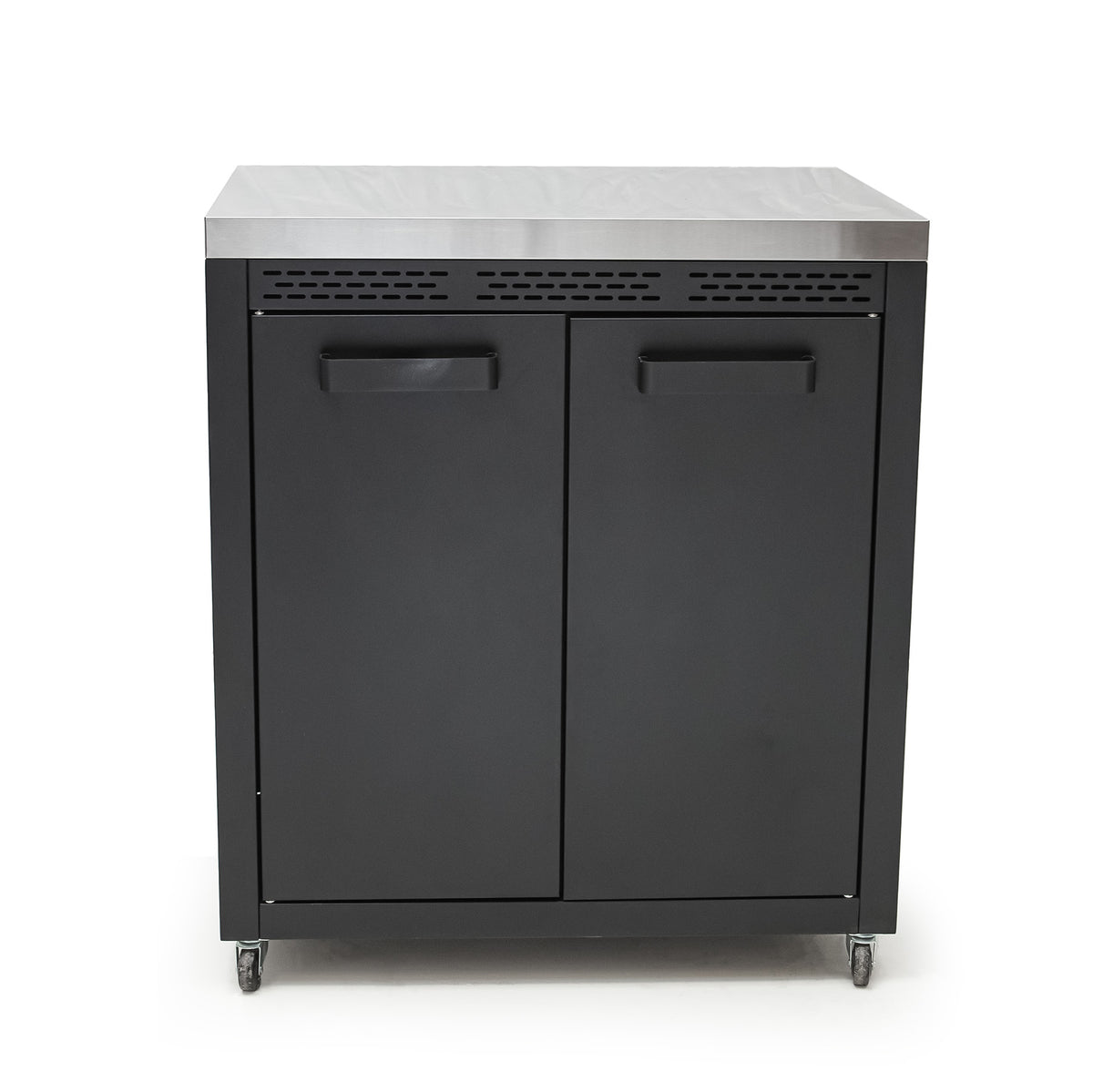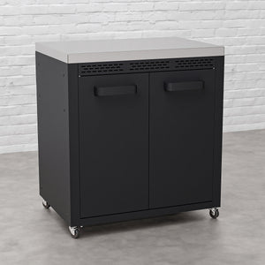 • Enhance your outdoor kitchen with the Draco Grills Titan Outdoor Kitchen Double Door Cabinet with Stainless Steel Top. Featuring a sleek black powder-coated finish and a durable stainless steel work surface, this stylish cabinet offers the perfect combination of modern aesthetics and practical functionality.