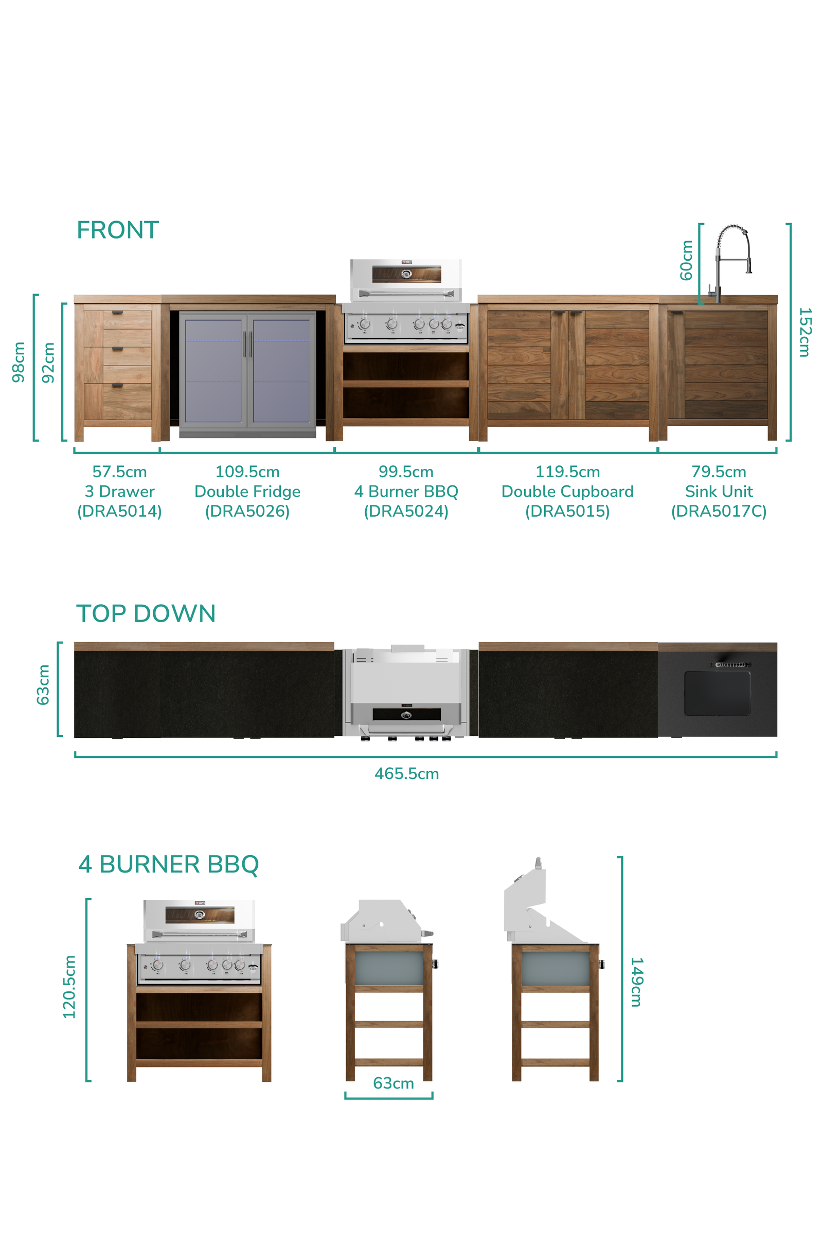 This Draco Grills Teak Outdoor Kitchen is ideal for those who routinely entertain outside or host parties on occasion. It includes a 4 burner gas BBQ, triple drawer unit, double cupboard, sink, and double fridge. This outdoor cooking area will great in your garden thanks to the rustic combination of reclaimed Teak and ceramic counters. It also covers the principles of cooking and entertaining for medium to large parties.