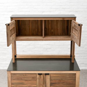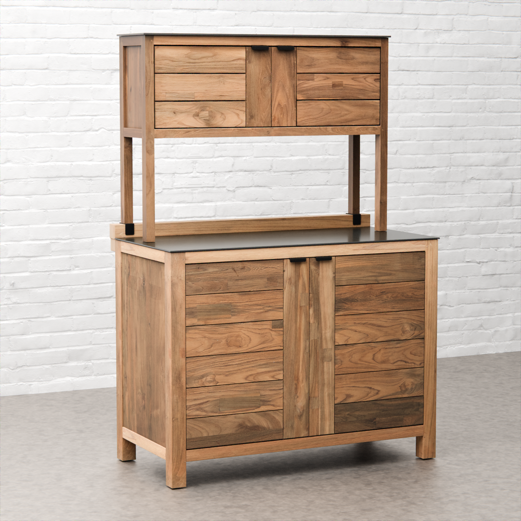 • The Draco Grills Teak Modular Outdoor Kitchen 2-Door Add-On High Cabinet with Ceramic Top is the perfect solution for expanding your outdoor cooking and storage space with style and sustainability. Made from reclaimed teak wood, this cabinet offers a timeless, rustic appeal while contributing to eco-friendly living by repurposing high-quality materials. The naturally durable teak is resistant to the elements, ensuring long-lasting beauty and performance even in harsh outdoor conditions.