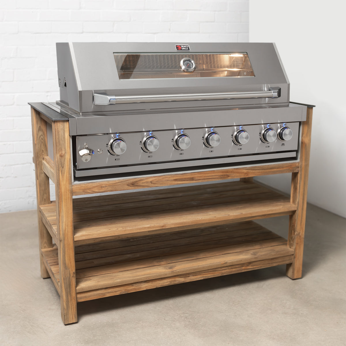 • The Draco Grills DRA5027 is a 6 burner BBQ complete with housing unit constructed from stunning Reclaimed Teak that will look fantastic in your garden.