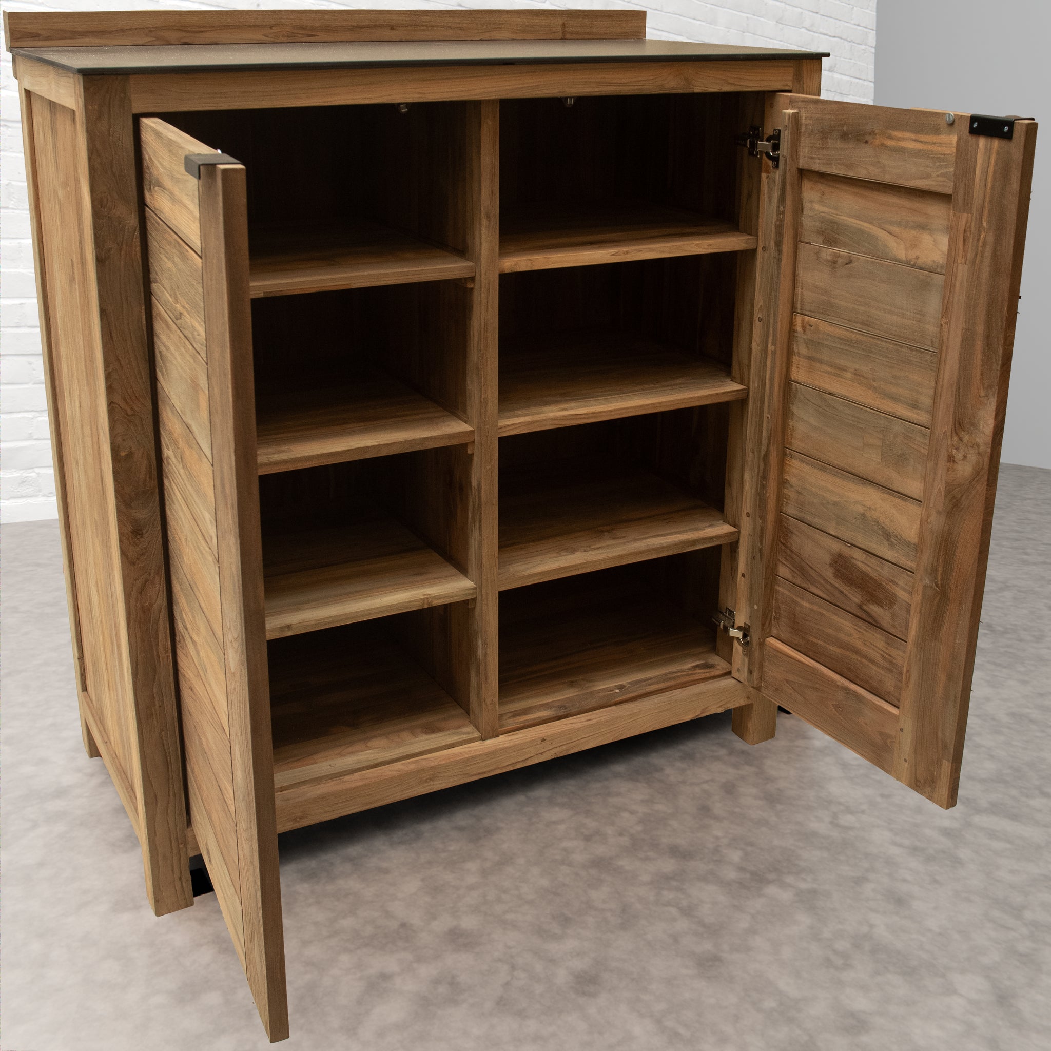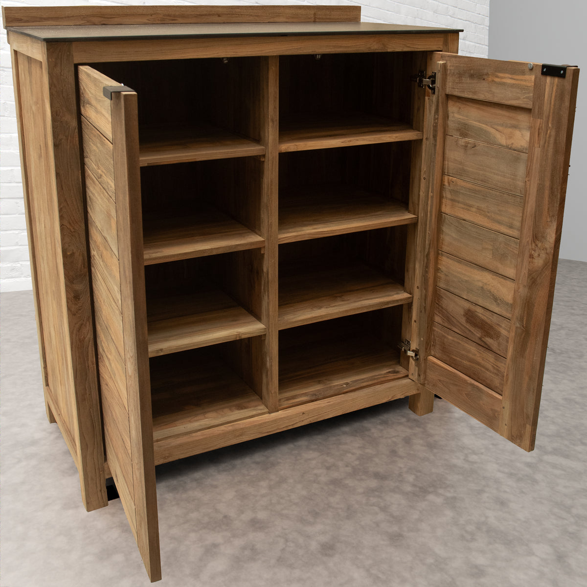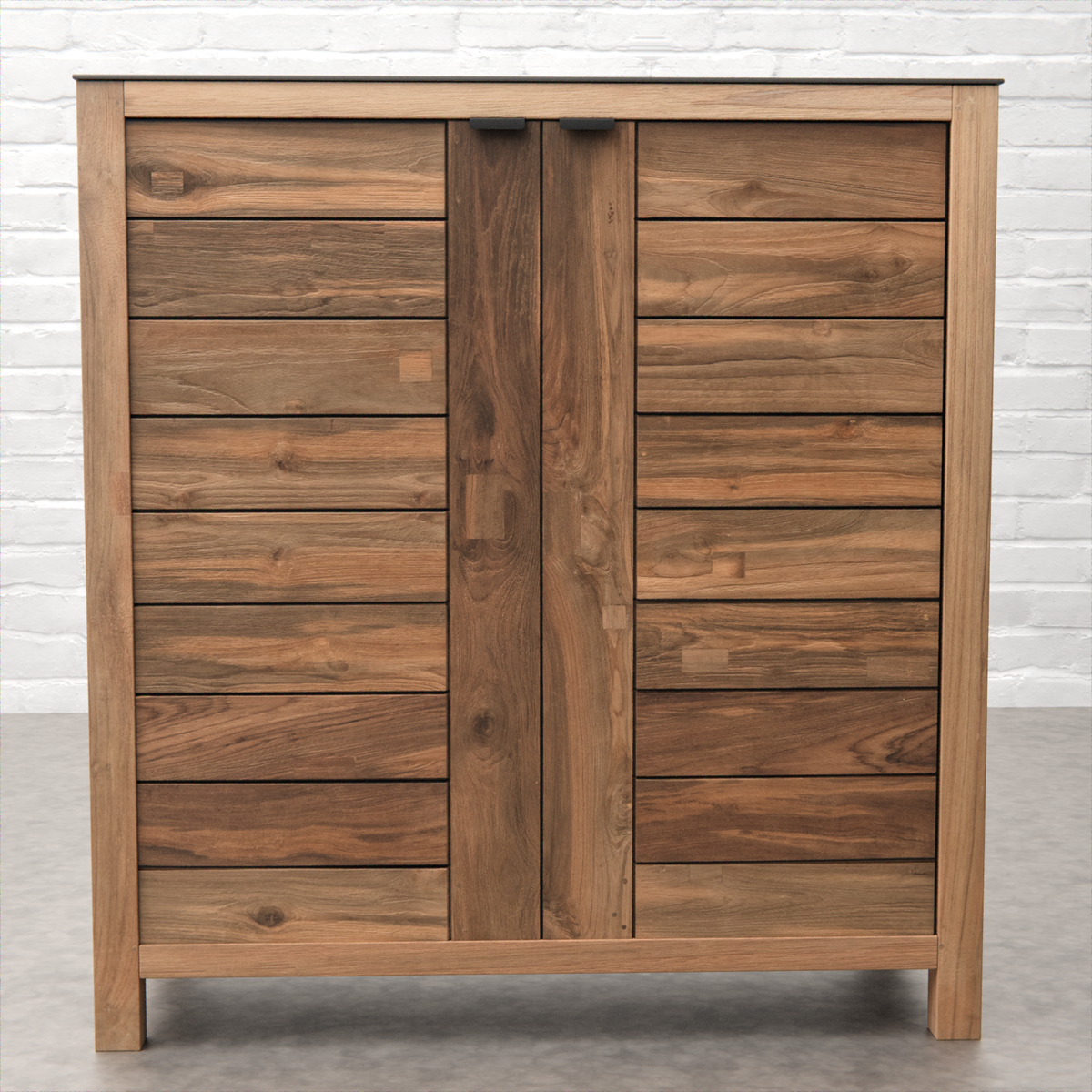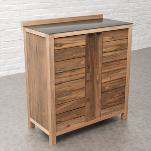 The mid-height double doors provide easy access to generous storage space, perfect for storing your grilling tools, kitchen accessories, and other essentials. The sleek ceramic top not only adds a sophisticated, heat-resistant surface for food prep, serving, or entertaining, but also complements the rustic charm of the reclaimed teak.