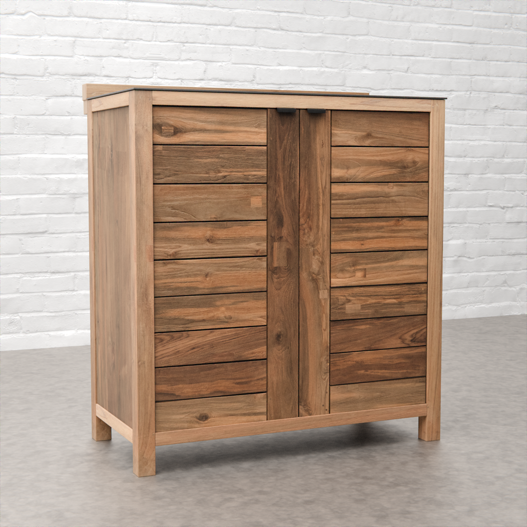 • The Draco Grills Teak Modular Outdoor Kitchen Mid Height Double Door Cabinet with Ceramic Top is the perfect blend of sustainable craftsmanship and modern elegance for your outdoor kitchen. Made from premium reclaimed teak, this cabinet showcases the natural beauty and durability of the wood while supporting eco-friendly living by repurposing high-quality materials. The teak is weather-resistant, ensuring the cabinet will maintain its beauty and functionality, even in challenging outdoor conditions.
