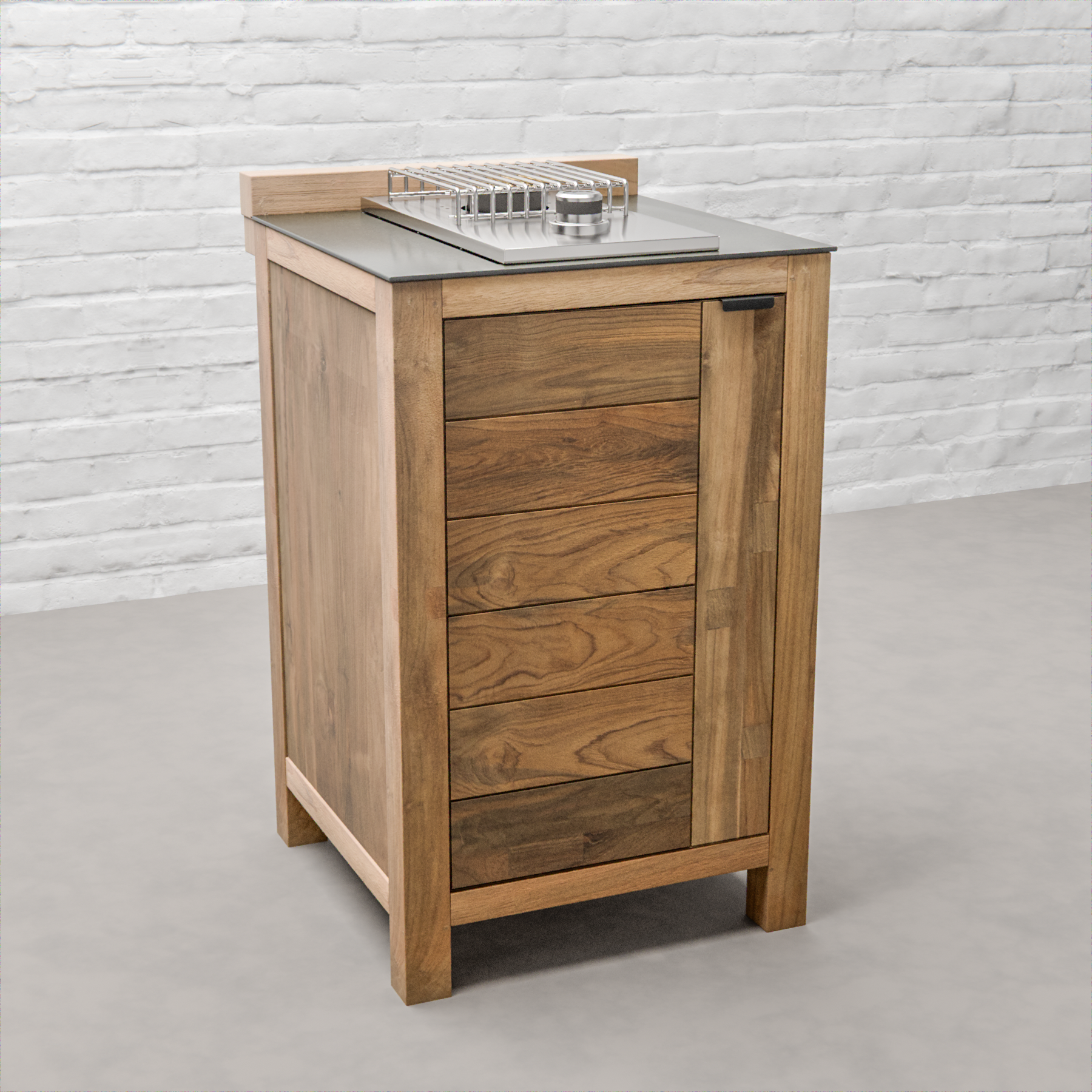 This cabinet houses a stainless steel side burner, providing extra cooking power for your outdoor kitchen setup. Whether you’re simmering sauces, boiling water, or searing steaks, the side burner adds versatility and convenience to your grilling station. The sleek ceramic top not only complements the natural teak but also offers a heat-resistant, easy-to-clean surface perfect for food prep or serving.