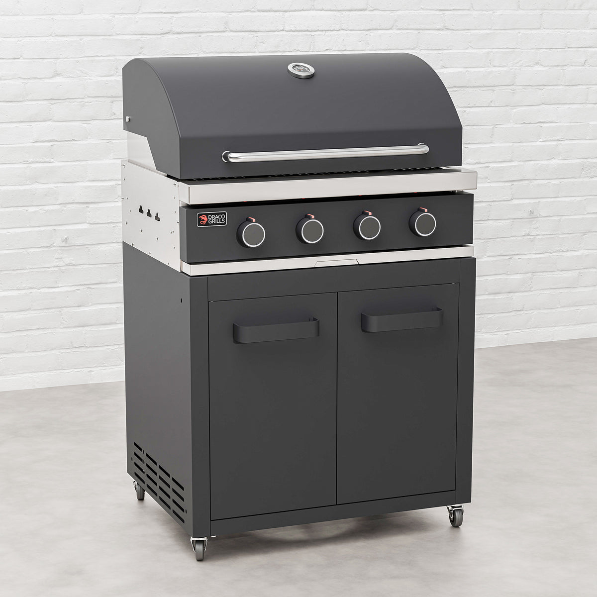 • Transform your backyard into a luxurious outdoor cooking space with the Draco Grills Titan 4 Burner Black Outdoor Kitchen Gas Barbecue with Side Burner Cabinet. This sleek, black powder-coated and stainless steel 4-burner gas barbecue and side burner cabinet with stainless steel top combo, combines modern design with premium performance, making it the ultimate addition to any patio or outdoor gathering area.