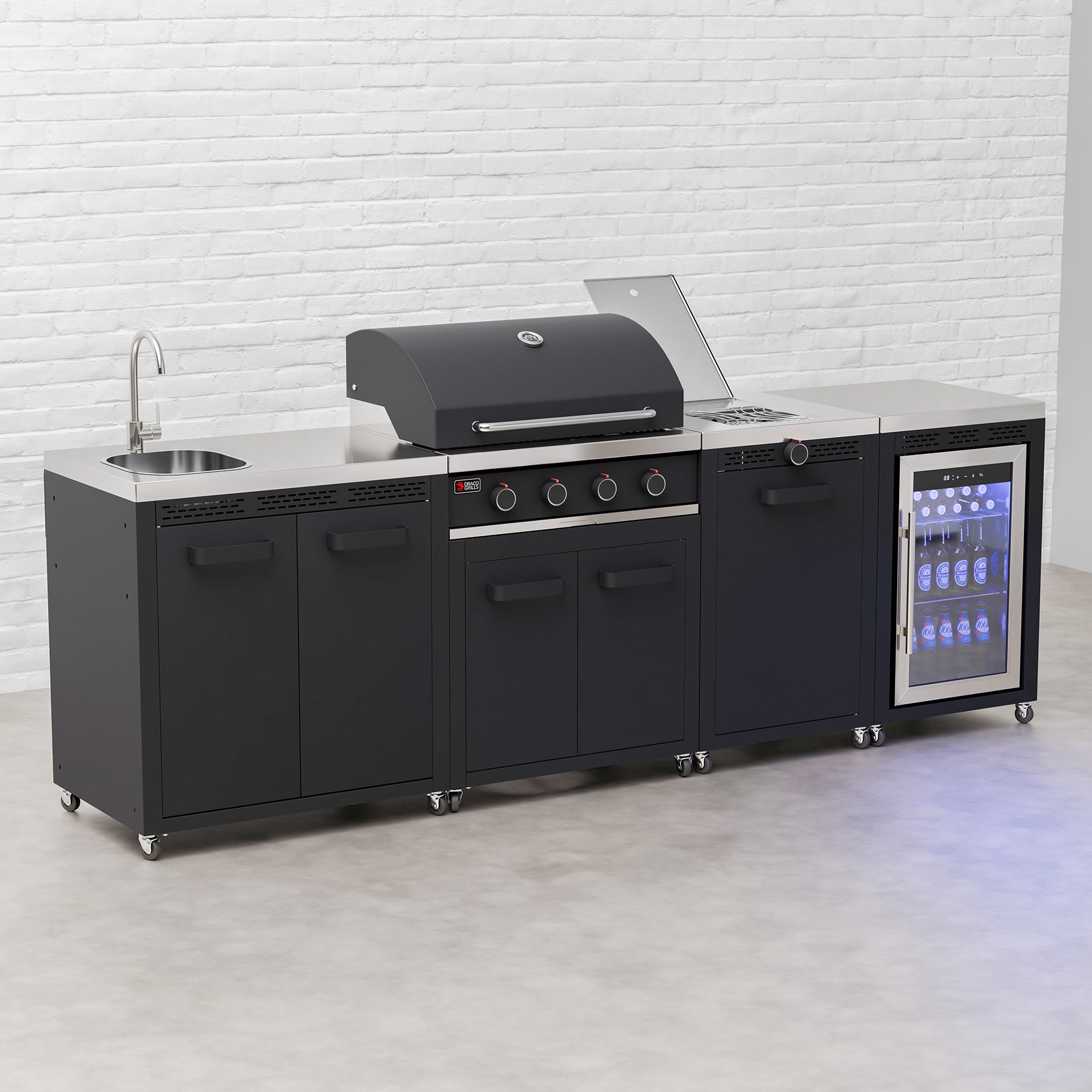 It's ideal for catering medium to large-sized gatherings because it can be combined with many modular components to construct your own outdoor kitchen. Options include cabinets, sinks, fridges; all are very well-made and affordably priced!
