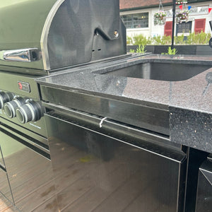 This Draco Grills Fusion Black Modular Outdoor Kitchen comes with everything you need to construct your ideal outdoor cooking space. This set-up comes with a double-door cabinet, a sink, and a 6 burner gas BBQ.