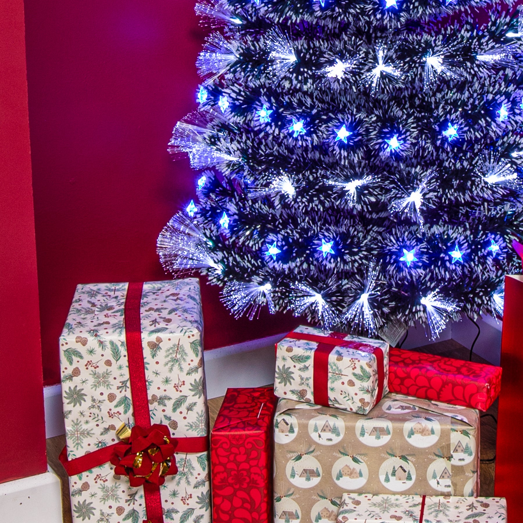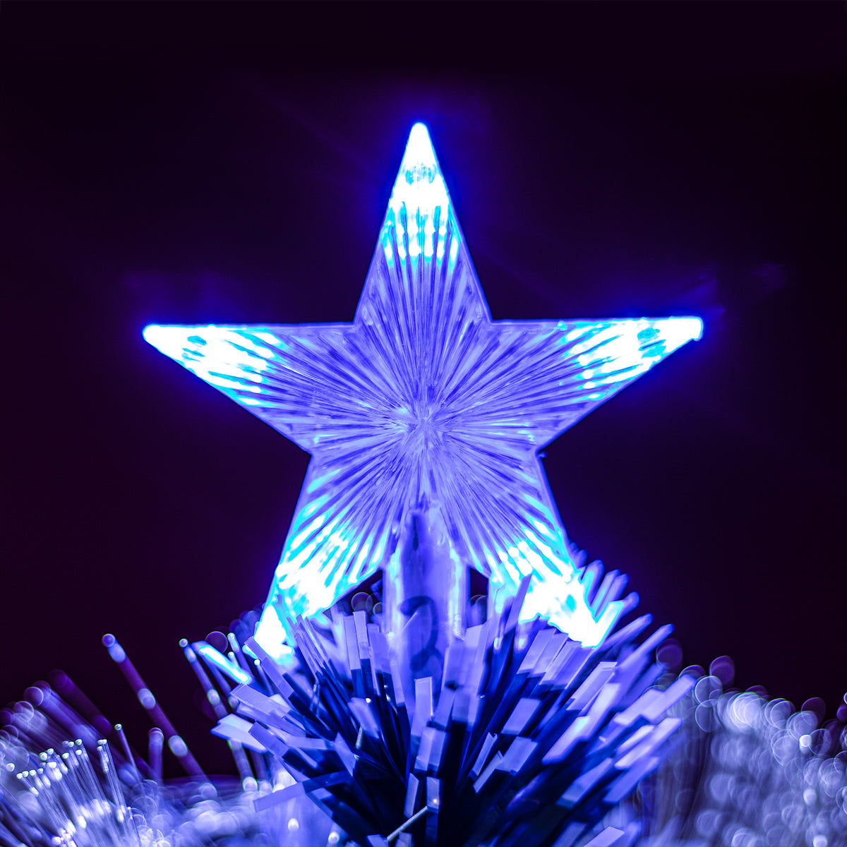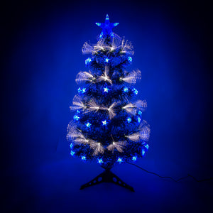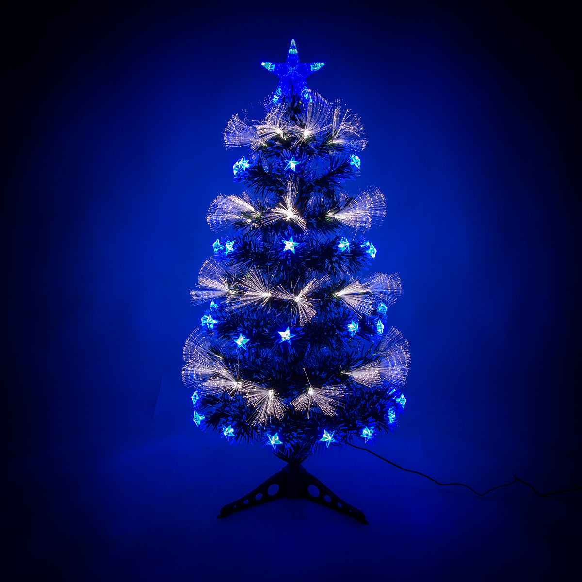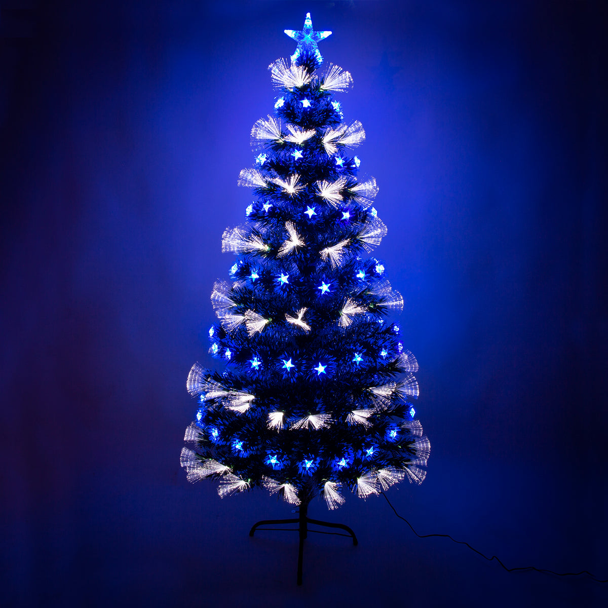 • This Green Fibre Optic Christmas Tree with Blue LEDs has white fibre optic lights and multifunction LED star lights, providing a bright statement in any room.